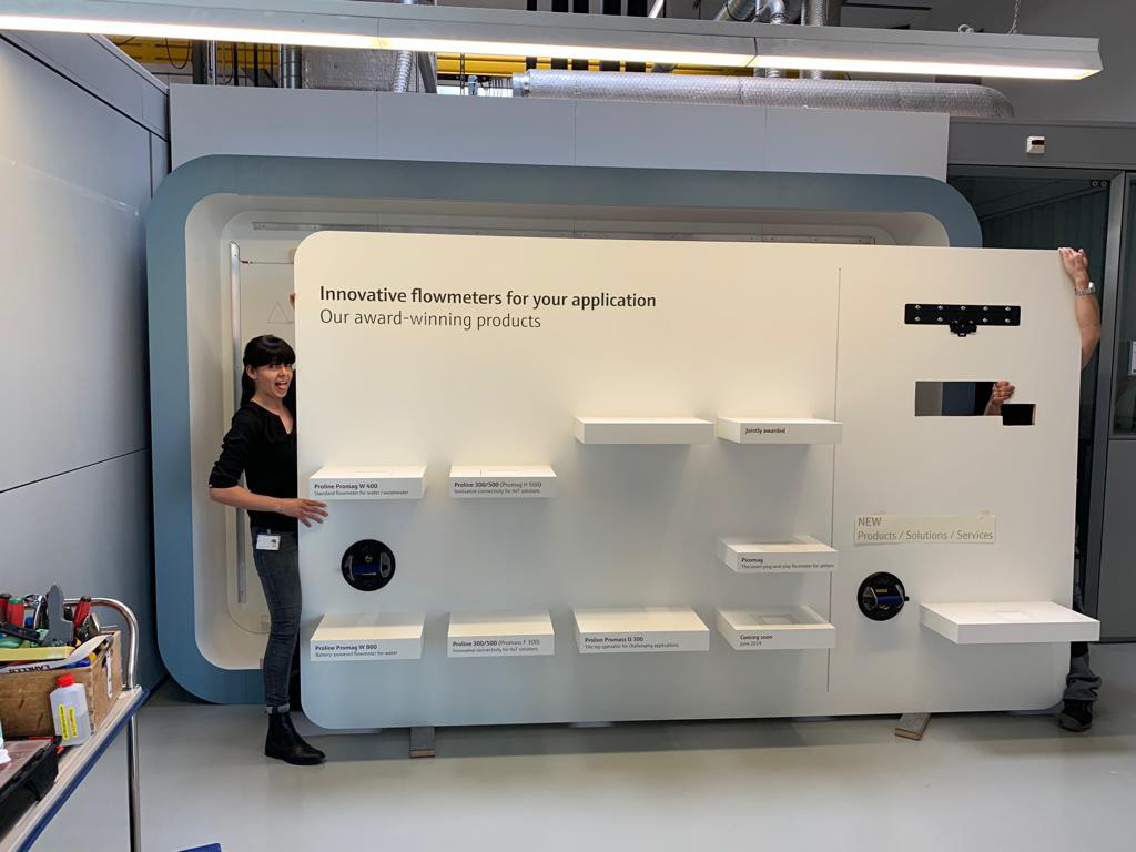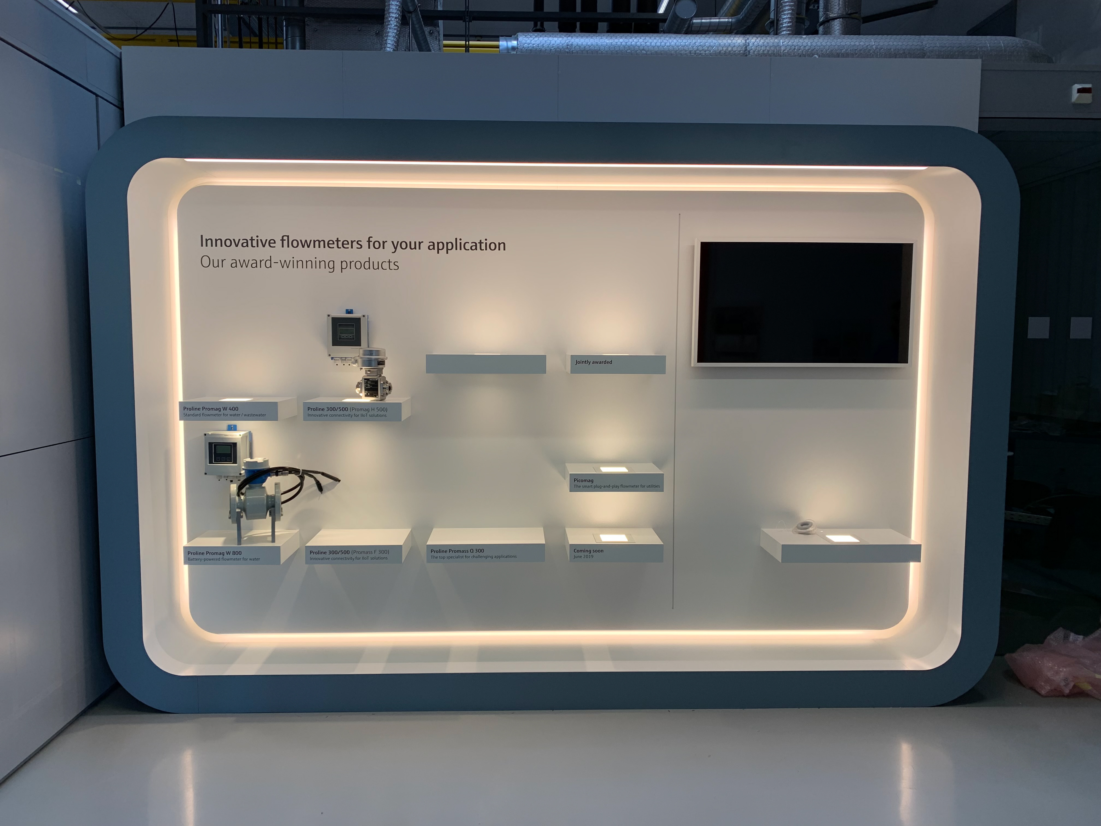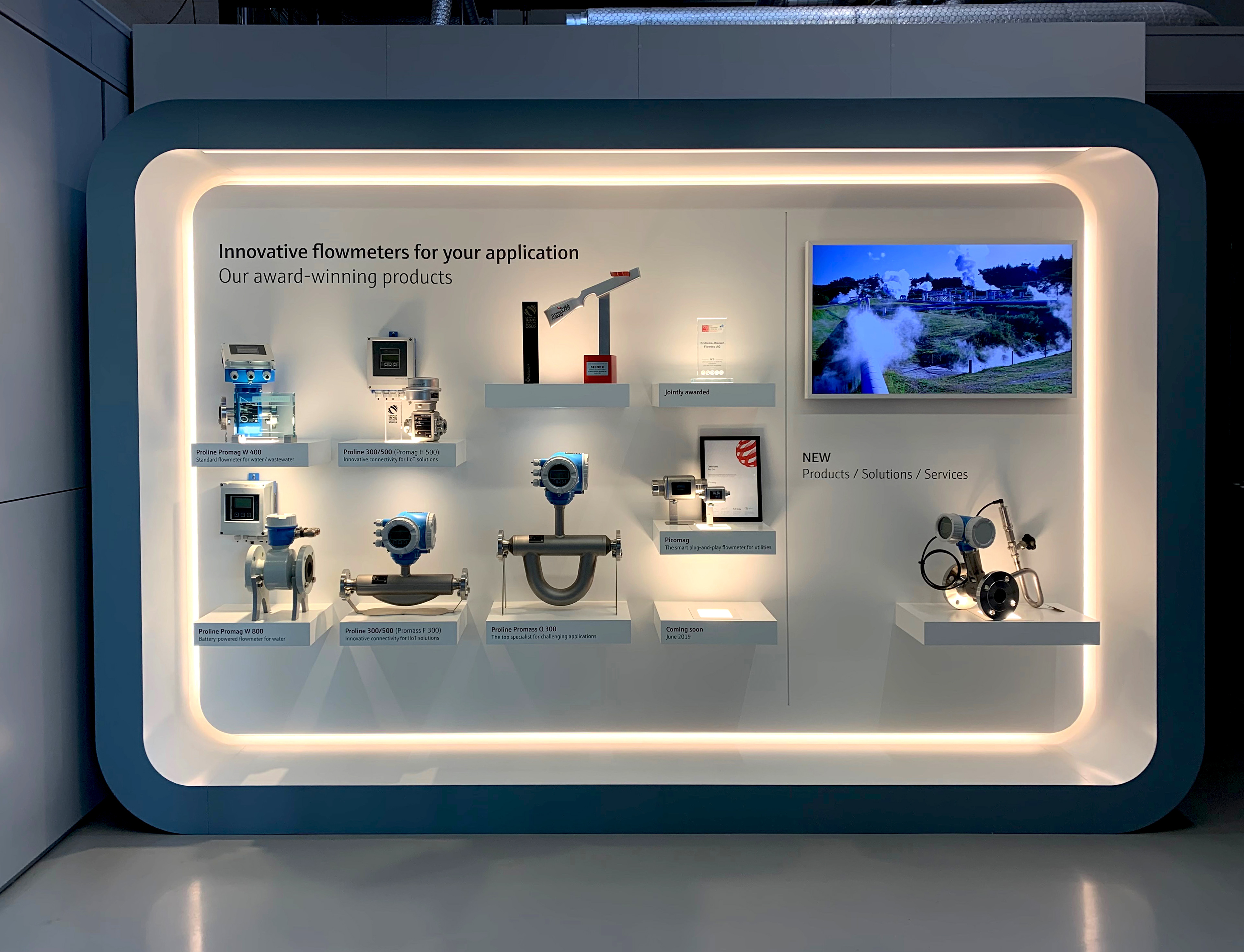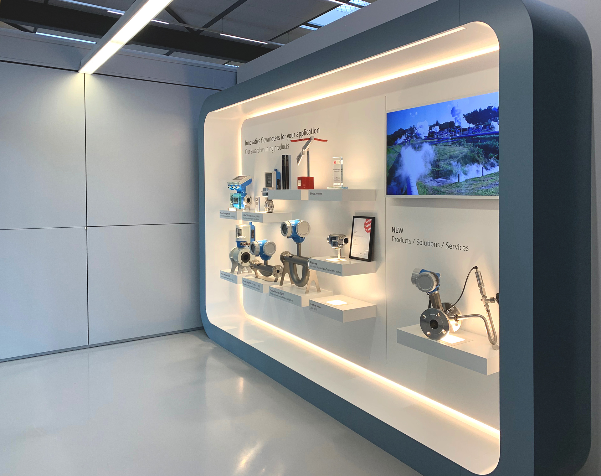 Endress+Hauser Flowtec showcased its history (around six decades) through a traditional display of milestone products in the main entrance area. As the company’s innovation pace accelerated, this “History Showcase” no longer represented its forward-looking spirit. A new installation – the Innovation Wall – was envisioned to shift focus from the past to the future.